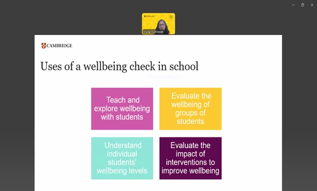 4th July - online - Cambridge Wellbeing Check - The resource person was Ms. Arpita Mukherjee. The session emphasized that learner wellbeing is intrinsically linked to academic success.